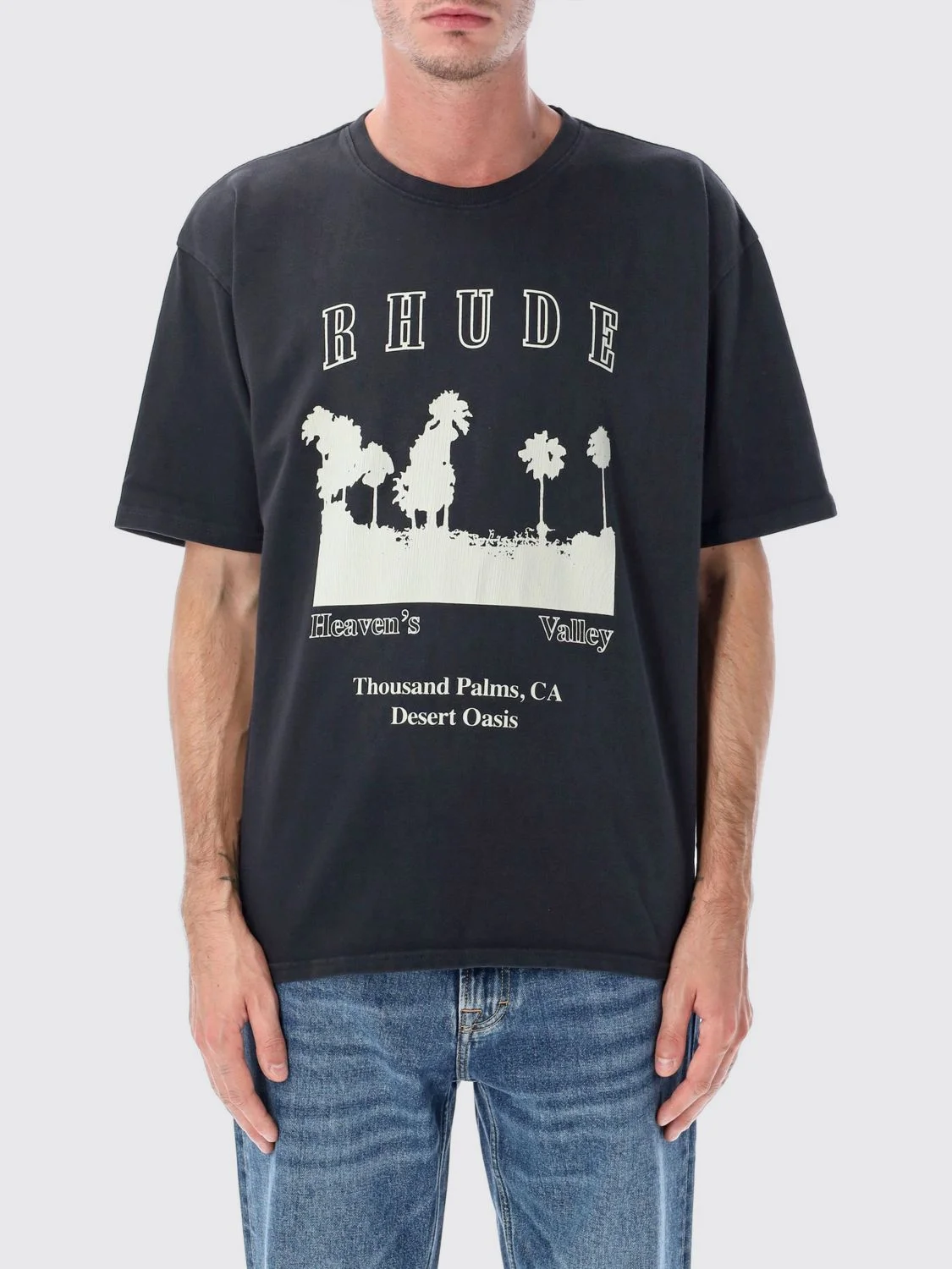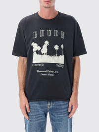 DESCRIPTION - Style: Sporty, Vintage - Logo: Print - Model: Crewneck - Neckline: Crewneck - Shoulders: Relaxed - Sleeves: Short - Bottom: With straight hemline - Materials: Cotton - Pattern: Graphic DETAILS AND CARE Composition not available SIZE AND FIT Sizes not available Size and fit Regular fit Designer code: RHFW25TT02012 3158 Giglio Code: H51687 Designer: Rhude Collection: Rhude Men Category: Clothing Rhude