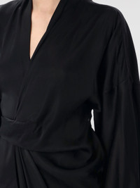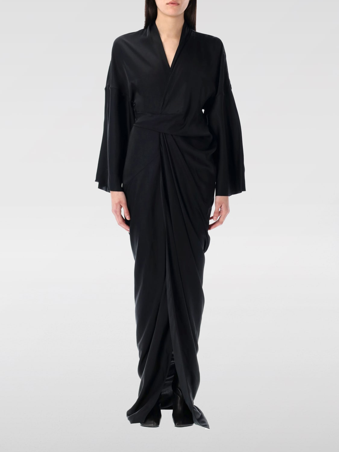 DESCRIPTION - Style: Classic - Model: Draped - Neckline: V neckline - Shoulders: Relaxed - Waist: With waist band to tie - Bottom: With front slit - Length: Long dresses - Occasion: Evening and party dresses - Sleeves: Long sleeve dresses - Materials: Viscose blend - Pattern: Plain-colored DETAILS AND CARE Composition 61% acetate 39% viscose SIZE AND FIT Sizes not available Size and fit Relaxed fit Designer code: RP01E7566SCH 09 Giglio Code: G63292 Designer: Rick Owens Collection: Rick Owens Woman Category: Clothing Rick Owens