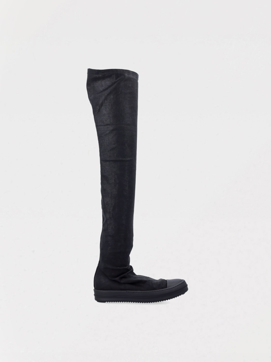 DESCRIPTION - Model: Thigh high boots - Toe: Rubber - Shaft: Over-the-knee - Sole: Rubber - Lining: Canvas - Materials: Stretch denim - Pattern: Plain-colored DETAILS AND CARE Composition Upper 90% cotton 7% polyester 3% rubber Toe 7 SIZE AND FIT Sizes not available Designer code: DS01E3812SCF 09ALL Giglio Code: G96347 Designer: Rick Owens Drkshdw Collection: Rick Owens Drkshdw Woman Category: Shoes Rick Owens Drkshdw