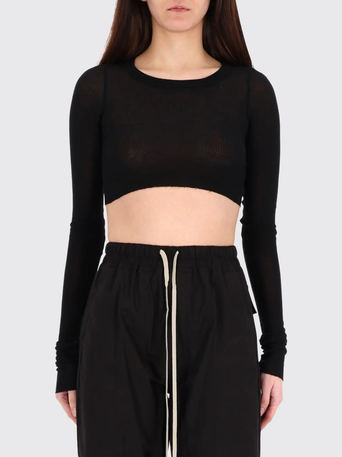 DESCRIPTION - Style: Contemporary - Model: Crewneck - Neckline: Crewneck - Shoulders: Regular - Sleeves: Long - Bottom: With straight hemline - Materials: Viscose - Pattern: Plain-colored DETAILS AND CARE Composition VISCOSE SIZE AND FIT Sizes not available Size and fit Cropped fita , Slim fit Designer code: RP01F6220RC 09 Giglio Code: H88254 Designer: Rick Owens Collection: Rick Owens Woman Category: Clothing Rick Owens