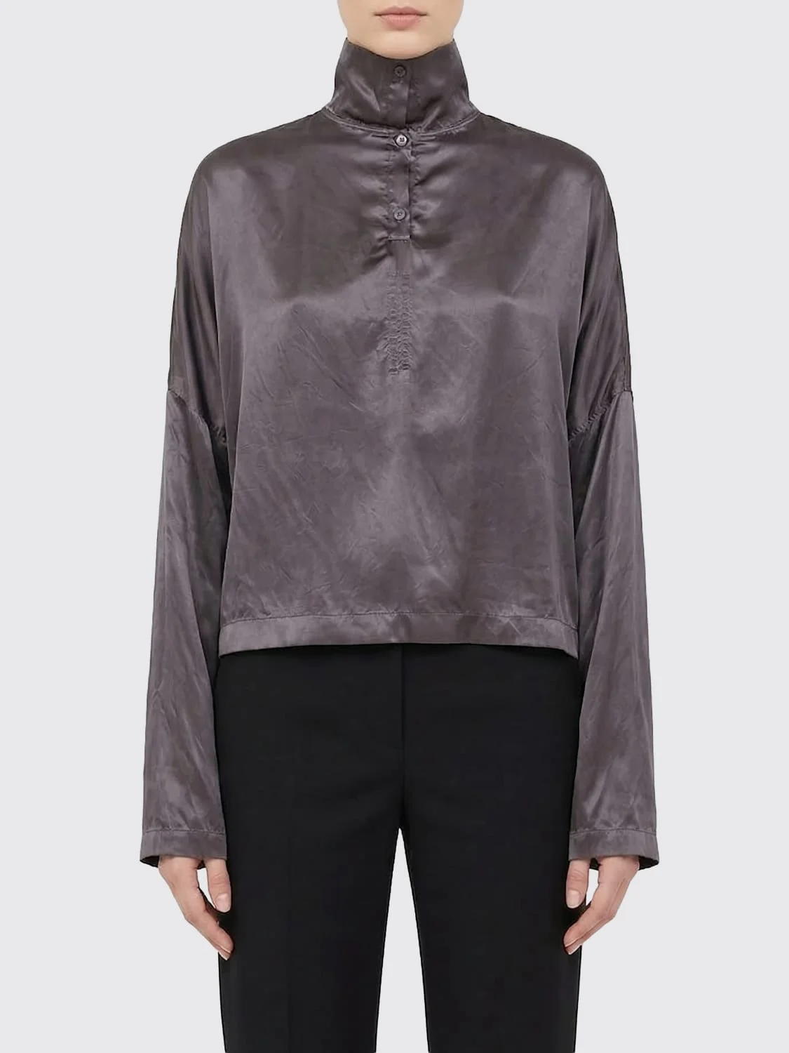 DESCRIPTION - Style: Minimal - Neck: Turtleneck - Shoulders: Regular - Closure: Back closure with buttons - Bottom: With straight hemline - Sleeves: Long sleeve tops - Materials: Cupro - Pattern: Plain-colored DETAILS AND CARE Composition Cupro | 100% CUPRO SIZE AND FIT Sizes not available Size and fit Regular fit Designer code: RP01F6216N 78 Giglio Code: H90863 Designer: Rick Owens Collection: Clothing Rick Owens Category: Clothing > Top