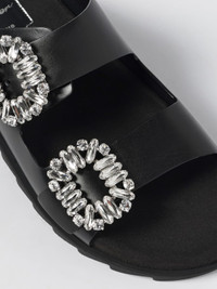 DESCRIPTION - Style: Glamour - Details: With rhinestones, With jewel buckle - Lining: Leather, With laminated logo - Model: Slip on - Closure: With double belt with buckles - Toe: Open, Round - Heel: Open - Sole: Rubber - Heel: Low - Materials: Smooth calfskin - Pattern: Plain-colored DETAILS AND CARE Composition 100%CALFSKIN SIZE AND FIT Sizes not available Designer code: RVW45818820BSS B999 Giglio Code: 401568 Designer: Roger Vivier Collection: Roger Vivier Woman Category: Shoes Roger Vivier