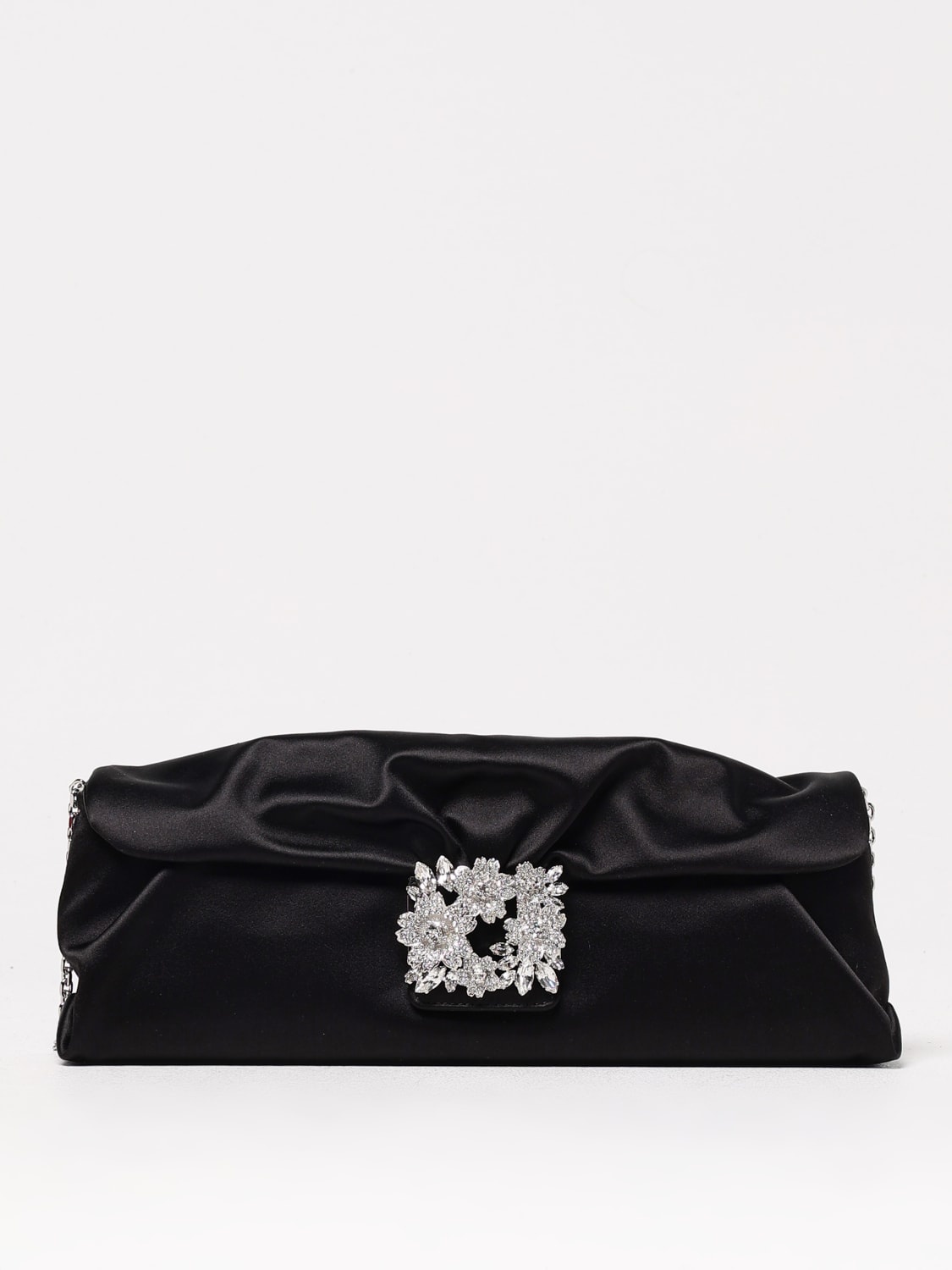 DESCRIPTION - Style: Elegant, Glamour - Occasion: Ceremony, Party - Details: With jewel buckle - Model: Draped, Hand, Crossbody - Closure: Magnetic - Shape: Rectangular - Shoulder strap: Metal mesh - Materials: Satin - Pattern: Plain-colored DETAILS AND CARE Composition 33% SE 67% VI SIZE AND FIT Sizes Width : 31 cm Height: 10 cm Depth: 6 cm Designer code: RBWANVC0200RS0 B999 Giglio Code: 421686 Designer: Roger Vivier Collection: Roger Vivier Woman Category: Bags Roger Vivier