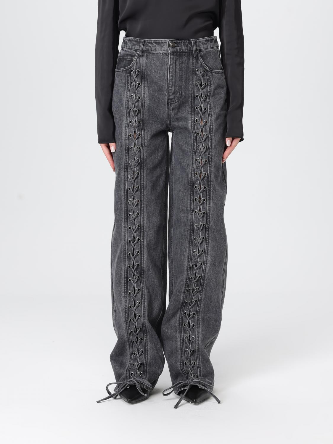 DESCRIPTION - Style: Urban-street - Pockets: 5-pocket - Waist: High waist - Bottom: With straight hemline - Details: With woven bands - Closure: With button and zip - Materials: Cotton denim - Pattern: Plain-colored DETAILS AND CARE Composition 100% Cotone SIZE AND FIT Sizes not available Size and fit Regular fit Designer code: 115069 100 Giglio Code: H32564 Designer: Rotate Collection: Rotate Woman Category: Clothing Rotate
