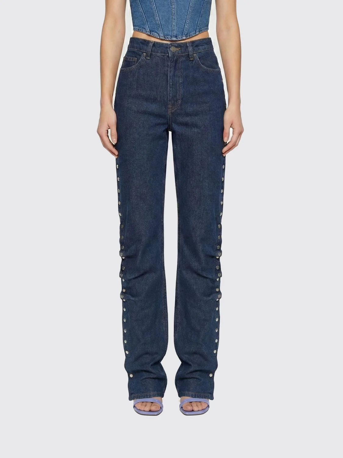 DESCRIPTION - Style: Casual, Urban-street - Details: With buttons - Pockets: 5-pocket - Waist: High waist - Bottom: With straight hemline - Closure: With button and zip - Materials: Cotton denim - Pattern: Plain-colored DETAILS AND CARE Composition 100% cotton SIZE AND FIT Sizes not available Size and fit Straight Designer code: 114816 D03 Giglio Code: H95934 Designer: Rotate Collection: Rotate Woman Category: Clothing Rotate