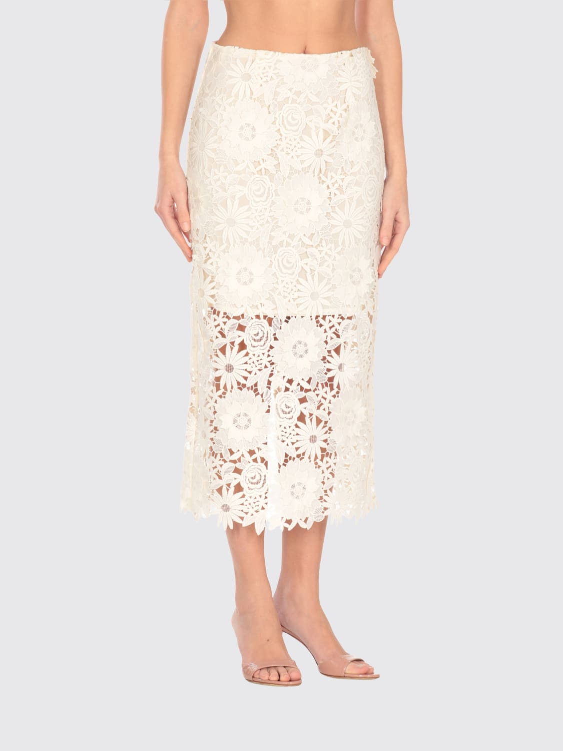 DESCRIPTION - Style: Romantic - Model: Transparent - Closure: Back closure with concealed zip - Waist: High - Bottom: With back slit - Length: Midi skirts - Materials: Lace - Pattern: Plain-colored DETAILS AND CARE Composition 100% Polyester; SIZE AND FIT Sizes not available Size and fit Slim fit Designer code: 114522 857 Giglio Code: G96572 Designer: Rotate Collection: Rotate Woman Category: Clothing Rotate