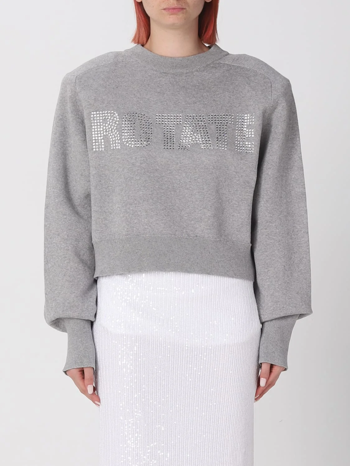 DESCRIPTION - Style: Contemporary - Logo: Rhinestone - Model: Crewneck - Neckline: Crewneck - Shoulders: Oversize, Padded - Sleeves: Long - Cuffs: Ribbed - Bottom: With ribbed edges - Materials: Cotton blend - Pattern: Embroidery, Logo DETAILS AND CARE Composition 95% COTTON (ORGANIC) 5% CASHMERE SIZE AND FIT Sizes not available Size and fit Cropped fita , Oversize Designer code: 1111521522 14-4201 Giglio Code: 394269 Designer: Rotate Collection: Rotate Woman Category: Clothing Rotate