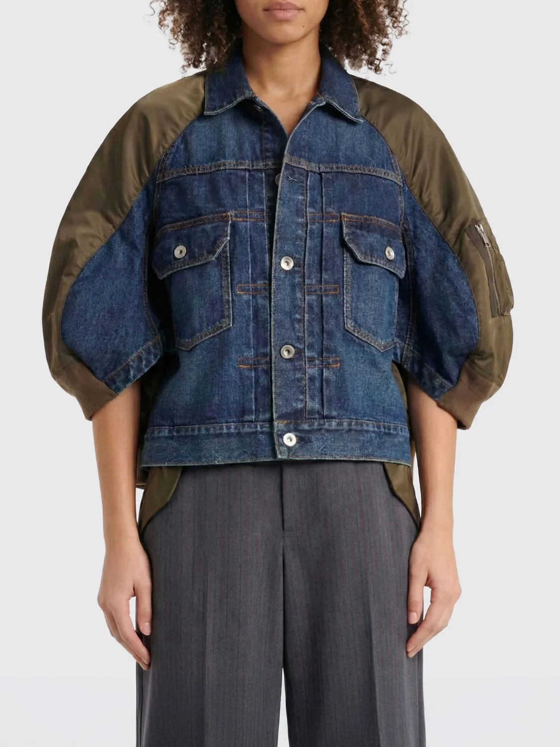 DESCRIPTION - Style: Urban-street - Lining: Unlined - Neck: Classic - Sleeves: Balloon , Long - Cuffs: Stretch - Closure: With buttons - Pockets: Patch pocket with flap and button - Bottom: With straight hemline - Length: Short jackets - Materials: Cotton denim, Nylon - Pattern: Bicolor DETAILS AND CARE Composition not available SIZE AND FIT Sizes not available Size and fit Regular fit Designer code: 2608312 435 Giglio Code: H94618 Designer: Sacai Collection: Clothing Sacai Category: Clothing > Blazer