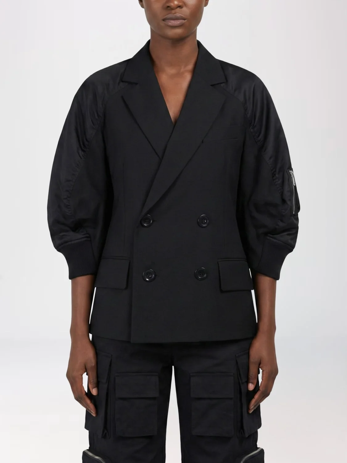 DESCRIPTION - Style: Contemporary, Elegant - Lining: Unlined - Model: Double-breasted - Neckline: V neckline - Sleeves: Balloon , Long - Closure: With buttons - Bottom: With straight hemline - Neck: Lapel - Pockets: With flap - Length: Short jackets - Materials: Wool blend - Pattern: Plain-colored DETAILS AND CARE Composition _70%WO 30%NY SIZE AND FIT Sizes not available Size and fit Regular fit Designer code: 2608284 001 Giglio Code: I01613 Designer: Sacai Collection: Clothing Sacai Category: Clothing > Blazer