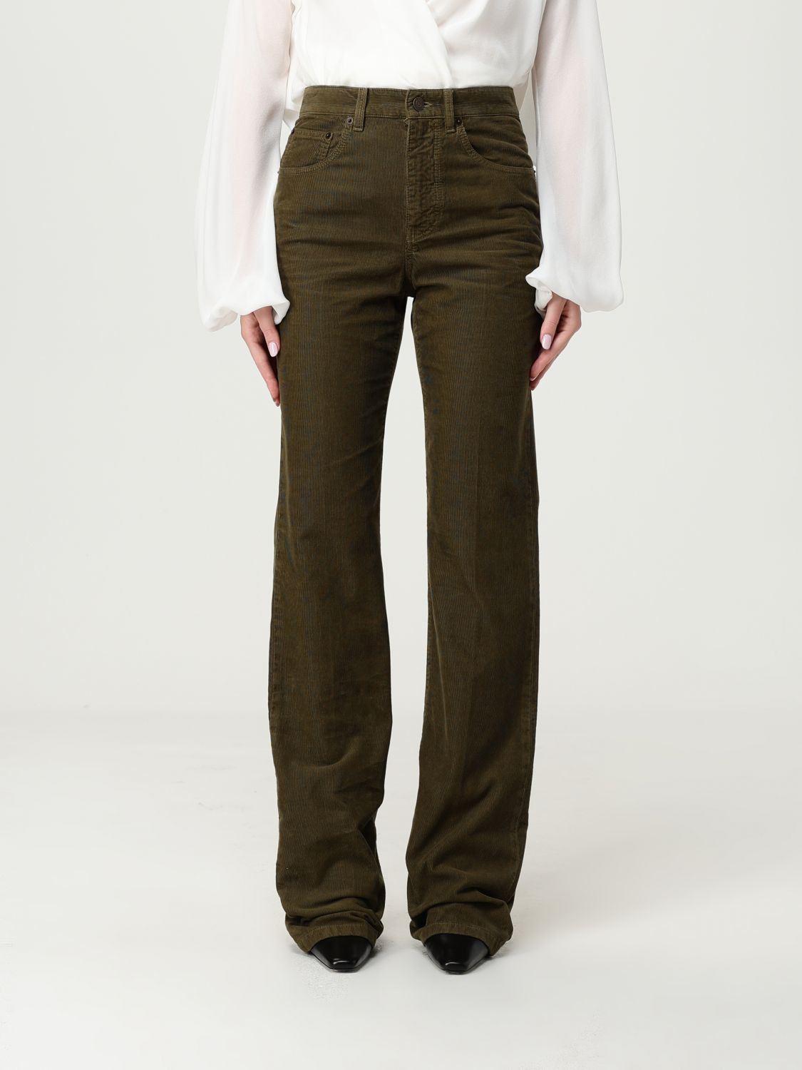 DESCRIPTION - Style: Casual - Pockets: 5-pocket - Waist: undefined - Bottom: With straight hemline - Closure: With button and zip - Model: Ribbed - Materials: Velvet - Pattern: Plain-colored DETAILS AND CARE Composition 100% cotton SIZE AND FIT Sizes not available Size and fit Regular fit Designer code: 705103Y29IA 3564 Giglio Code: H31242 Designer: Saint Laurent Collection: Saint Laurent Woman Category: Clothing Saint Laurent