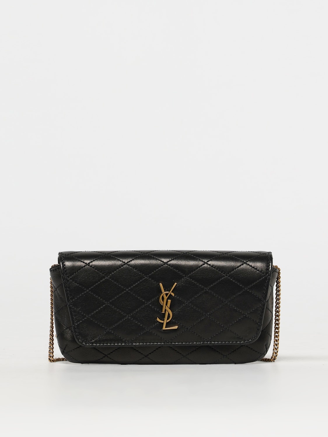 DESCRIPTION - Logo: Metallic, YSL monogram - Lining: Leather, With logo - Model: Quilted, Crossbody - Closure: With flap and magnetic buttons - Pockets: Back patch pocket - Shape: Rectangular - Shoulder strap: Metal mesh - Measurements: Shoulder strap length from shoulder: 51 cm - Materials: Nappa lambskin - Pattern: All-over monogram DETAILS AND CARE Composition 100% LAMB LEATHER SIZE AND FIT Sizes Width : 19 cm Height: 10 cm Depth: 4,5 cm Designer code: 7540511EL07 1000 Giglio Code: G84402 Designer: Saint Laurent Collection: Saint Laurent Woman Category: Bags Saint Laurent