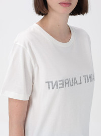 DESCRIPTION - Style: Sporty - Logo: Print - Model: Crewneck - Neckline: Crewneck - Shoulders: Regular - Sleeves: Short - Bottom: With straight hemline - Materials: Cotton - Pattern: Logo DETAILS AND CARE Composition 100 AF SIZE AND FIT Sizes not available Size and fit Regular fit Designer code: 665234Y37AW 9744 Giglio Code: 403150 Designer: Saint Laurent Collection: Saint Laurent Woman Category: Clothing Saint Laurent