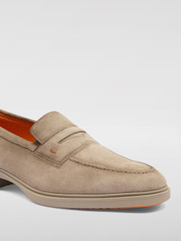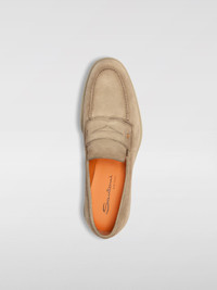 DESCRIPTION - Details: With penny keeper - Lining: With logo - Model: Slip on - Toe: Raised toe box - Sole: Rubber - Materials: Suede calfskin - Pattern: Plain-colored DETAILS AND CARE Composition UPPER: CALF 100%; LINING: GOAT 15% LAMB 85%; SIZE AND FIT Sizes not available Designer code: MGEO18964TAUXGEX M45 Giglio Code: G85234 Designer: Santoni Collection: Santoni Men Category: Shoes Santoni