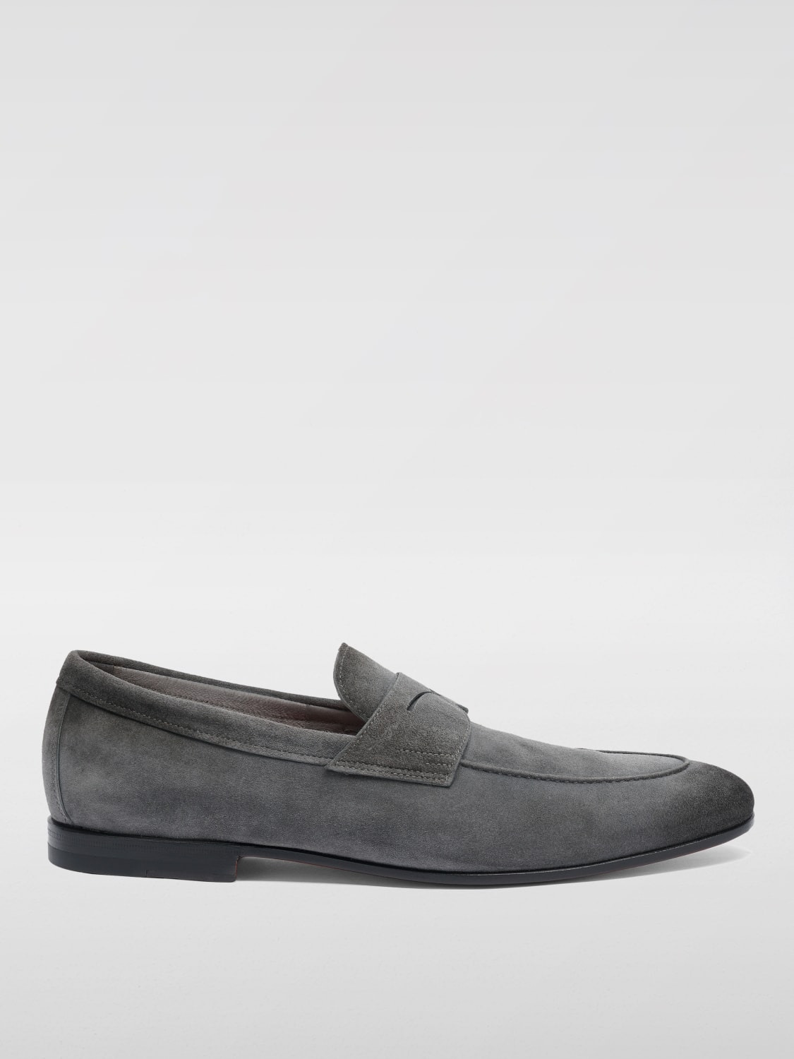 DESCRIPTION - Details: With penny keeper - Lining: With logo - Model: Slip on - Toe: Raised toe box - Sole: Leather - Materials: Suede calfskin - Pattern: Plain-colored DETAILS AND CARE Composition UPPER: CALF 100%; SOLE: LEATHER 100%; SIZE AND FIT Sizes not available Designer code: MCNC18837SA4SEAA G62 Giglio Code: G46503 Designer: Santoni Collection: Santoni Men Category: Shoes Santoni