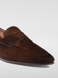 DESCRIPTION - Details: With penny keeper - Lining: With logo - Model: Slip on - Toe: Raised toe box - Sole: Leather - Materials: Suede calfskin - Pattern: Plain-colored DETAILS AND CARE Composition UPPER: CALF 100%; SOLE: LEATHER 100%; SIZE AND FIT Sizes not available Designer code: MCNC18837SA4SEAA S26 Giglio Code: G46503 Designer: Santoni Collection: Santoni Men Category: Shoes Santoni