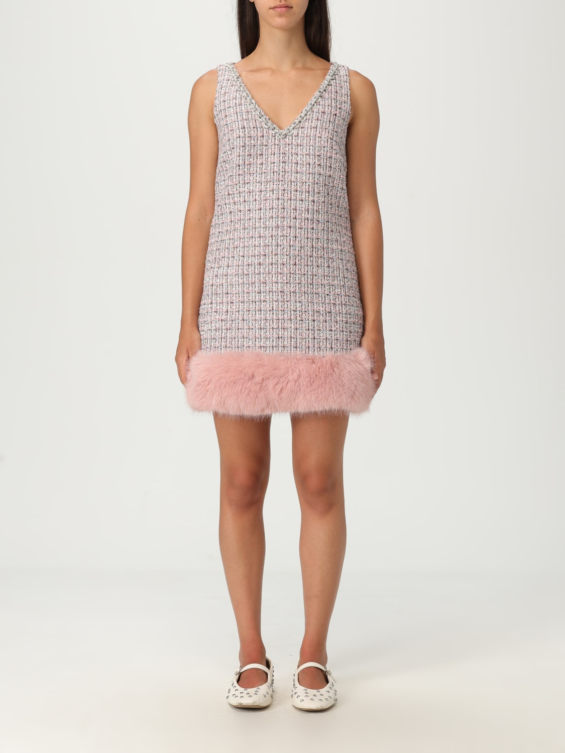 Pink Boucle Fur Hem Mini Dress