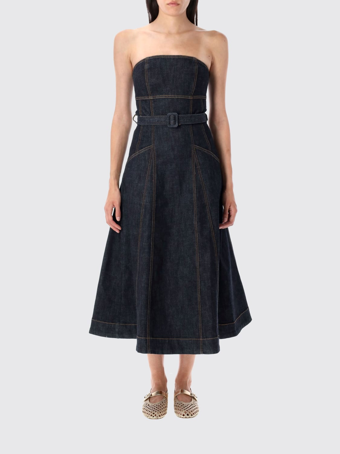 DESCRIPTION - Style: Urban-street - Neckline: Straight - Closure: Back closure with zip - Waist: With adjustable belt - Bottom: With straight hemline - Length: Midi dresses - Occasion: Evening and party dresses - Sleeves: Off-the-shoulder dresses - Materials: Cotton denim - Pattern: Plain-colored DETAILS AND CARE Composition 94% cotton 5% polyamide 1% elastane SIZE AND FIT Sizes not available Size and fit Regular fit Designer code: PF25801MABL BLUE Giglio Code: H13829 Designer: Self-Portrait Collection: Self-Portrait Woman Category: Clothing Self-Portrait