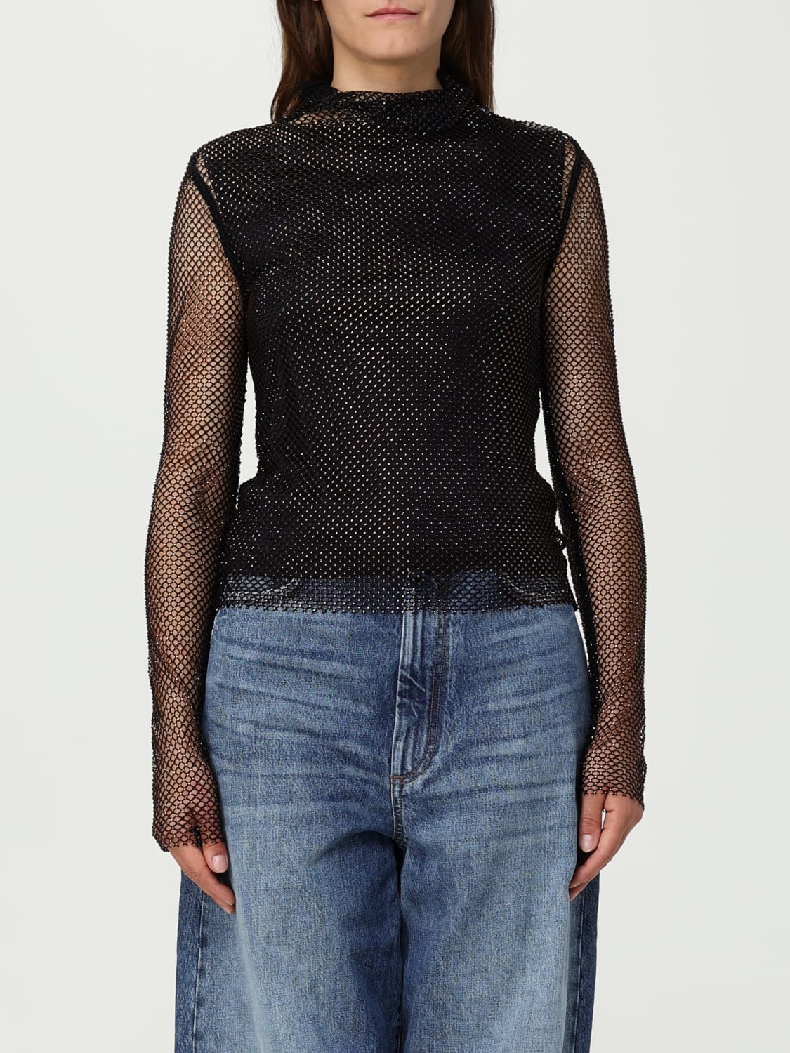 DESCRIPTION - Style: Glamour - Details: With rhinestones - Neck: High - Shoulders: Regular - Bottom: With straight hemline - Model: Fishnet - Sleeves: Long sleeve tops - Materials: Jersey - Pattern: undefined DETAILS AND CARE Composition BLUSA IN MAGLIA Tessuto a maglia 97% Pol SIZE AND FIT Sizes not available Size and fit Slim fit Designer code: 2522946061600 003 Giglio Code: 431659 Designer: Sportmax Collection: Sportmax Woman Category: Clothing Sportmax
