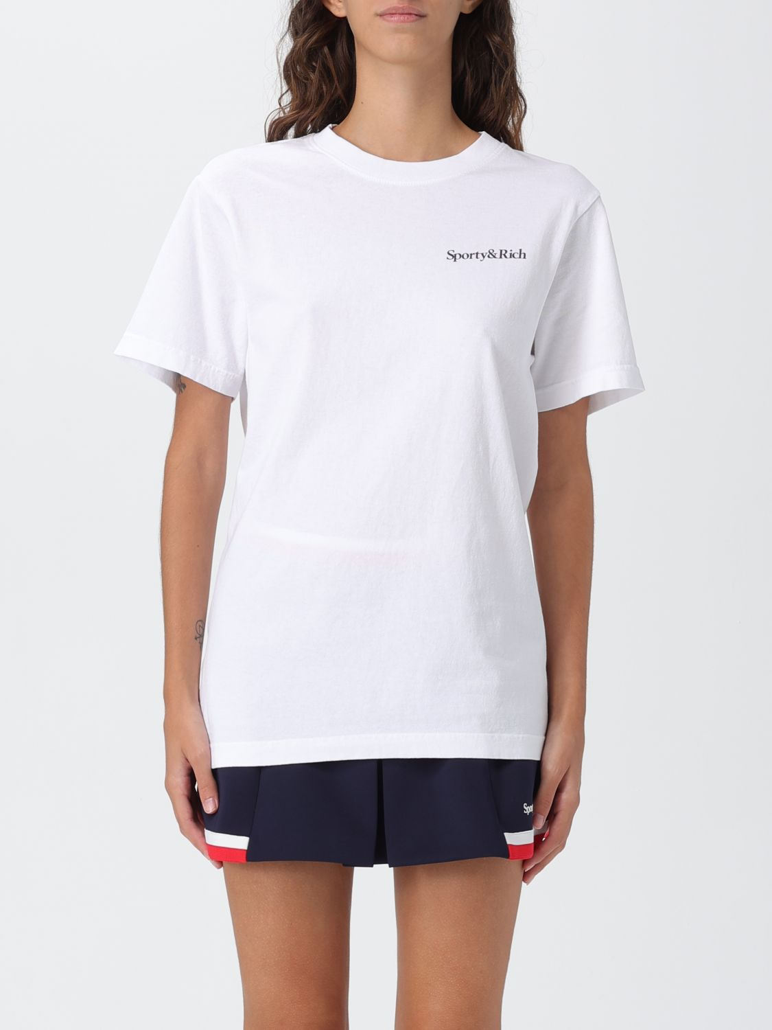 DESCRIPTION - Style: Sporty - Occasion: Morning - Logo: Contrasting - Model: Crewneck - Neckline: Crewneck - Shoulders: Relaxed - Sleeves: Short - Bottom: With straight hemline - Materials: Cotton - Pattern: Slogan DETAILS AND CARE Composition | SIZE AND FIT Sizes not available Size and fit Relaxed fit Designer code: TO043602006WH01 48 Giglio Code: H30722 Designer: Sporty & Rich Collection: Sporty & Rich Woman Category: Clothing Sporty & Rich