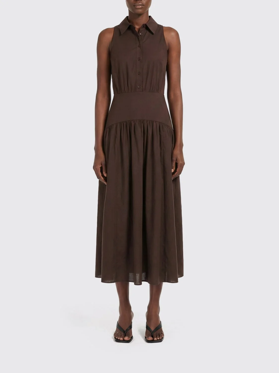 DESCRIPTION - Style: Casual - Model: Chemisier - Neck: Classic - Closure: With buttons - Bottom: With straight hemline - Shape: Wheel - Length: Midi dresses - Occasion: Morning dresses - Sleeves: Sleeveless dresses - Materials: Cotton - Pattern: Plain-colored DETAILS AND CARE Composition 98% cotton, 2% elastane SIZE AND FIT Sizes not available Size and fit Regular fit Designer code: R25S2245PO EART Giglio Code: H97001 Designer: Staud Collection: Staud Woman Category: Clothing Staud