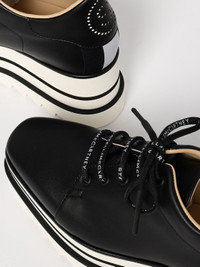 DESCRIPTION - Style: Contemporary - Occasion: Day - Logo: Back - Lining: Synthetic leather, With logo - Model: Wedge, Lace up - Toe: Tapered - Ankle: Low top - Sole: Dented tread, Rubber - Heel: High - Materials: Smooth synthetic leather - Pattern: Striped, All-over logo DETAILS AND CARE Composition POLYURETHANE SIZE AND FIT Sizes Heel: 8 cm Designer code: 810078E00085 1065 Giglio Code: F71173 Designer: Stella McCartney Collection: Stella McCartney Woman Category: Shoes Stella McCartney