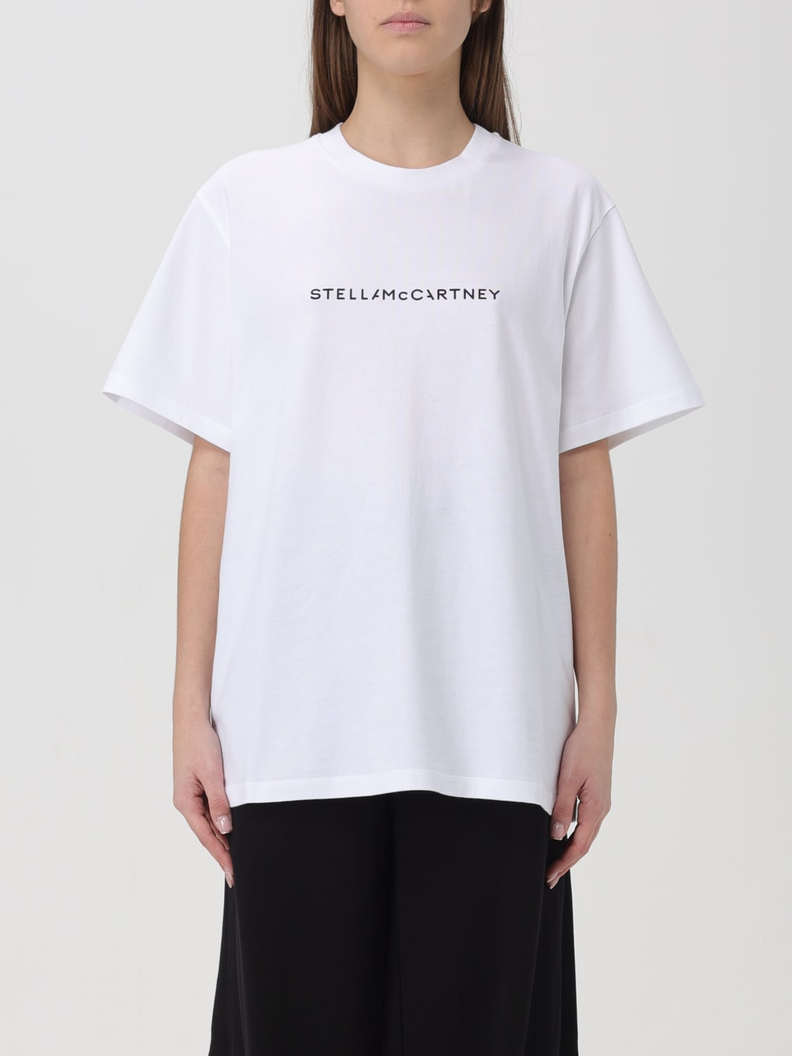 DESCRIPTION - Style: Basic, Contemporary - Logo: Contrasting - Neckline: Crewneck - Shoulders: Relaxed - Sleeves: Short - Bottom: With straight hemline - Materials: Cotton - Pattern: All-over logo DETAILS AND CARE Composition T: 100% COTTON SIZE AND FIT Sizes not available Size and fit Relaxed fit Designer code: 6J01583SPY48 9000 Giglio Code: 423765 Designer: Stella McCartney Collection: Stella McCartney Woman Category: Clothing Stella McCartney