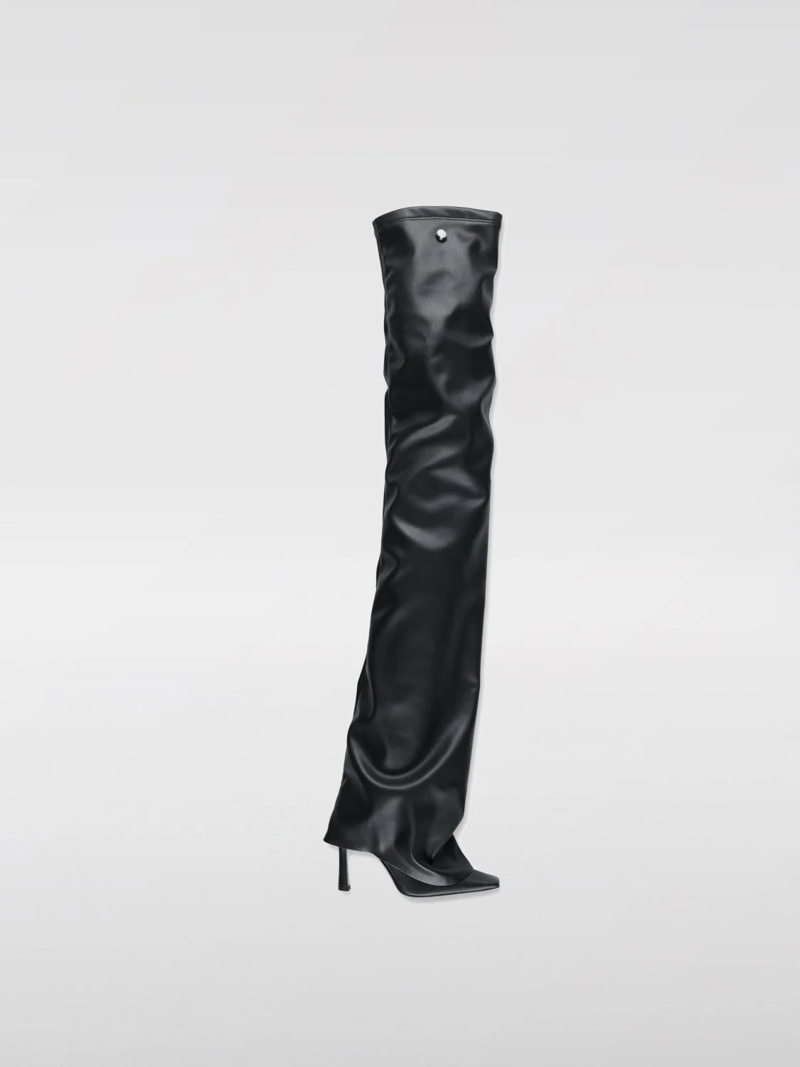 DESCRIPTION - Lining: Leather, With logo - Model: Thigh high boots - Toe: Squared - Shaft: Over-the-knee - Sole: Leather - Logo: With logo - Heel: Tacco alto a stiletto - Materials: Synthetic leather - Pattern: Plain-colored DETAILS AND CARE Composition 55% polyurethane 45% polyester Lining 100% go SIZE AND FIT Sizes Heel: 9,5 cm Designer code: WSH00872PUR003AA 100 Giglio Code: H22700 Designer: The Attico Collection: The Attico Woman Category: Shoes The Attico