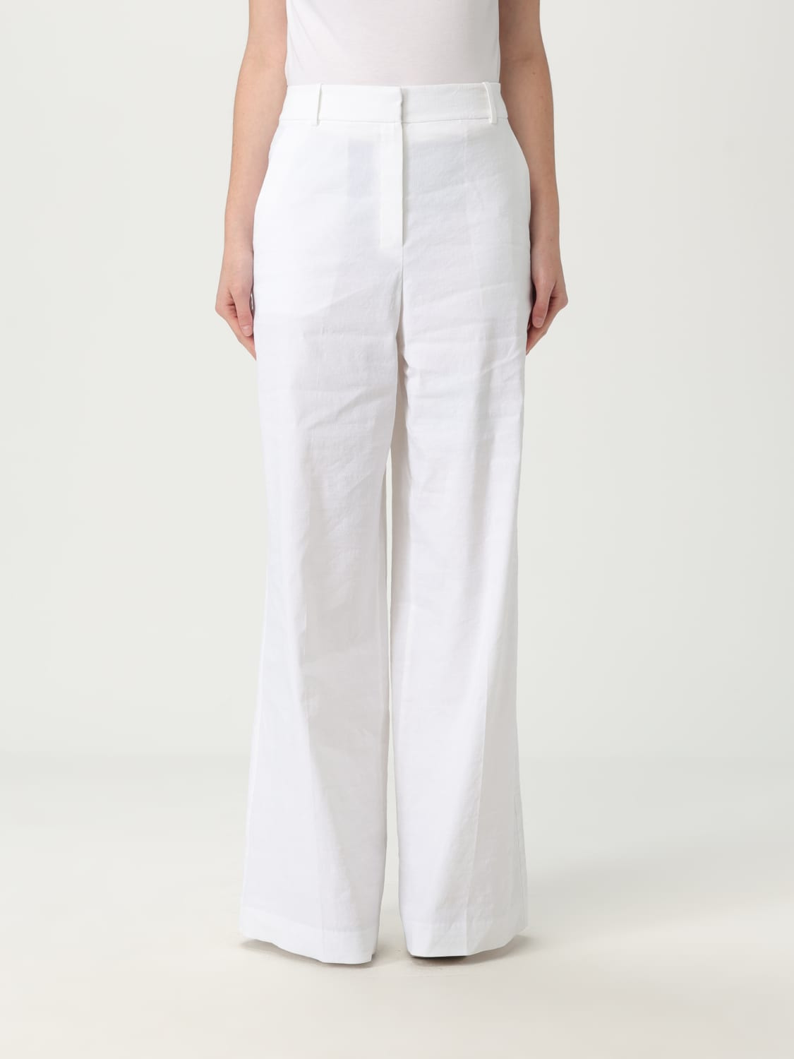DESCRIPTION - Style: Minimal - Model: Palazzo - Pockets: Back slit pocket - Waist: High waist - Bottom: With straight hemline - Closure: With button and zip - Materials: Linen blend - Pattern: Plain-colored DETAILS AND CARE Composition 65% li, 31% vi, 4% ea SIZE AND FIT Sizes not available Size and fit Regular fit Designer code: O0203211 100 Giglio Code: G88781 Designer: Theory Collection: Theory Woman Category: Clothing Theory