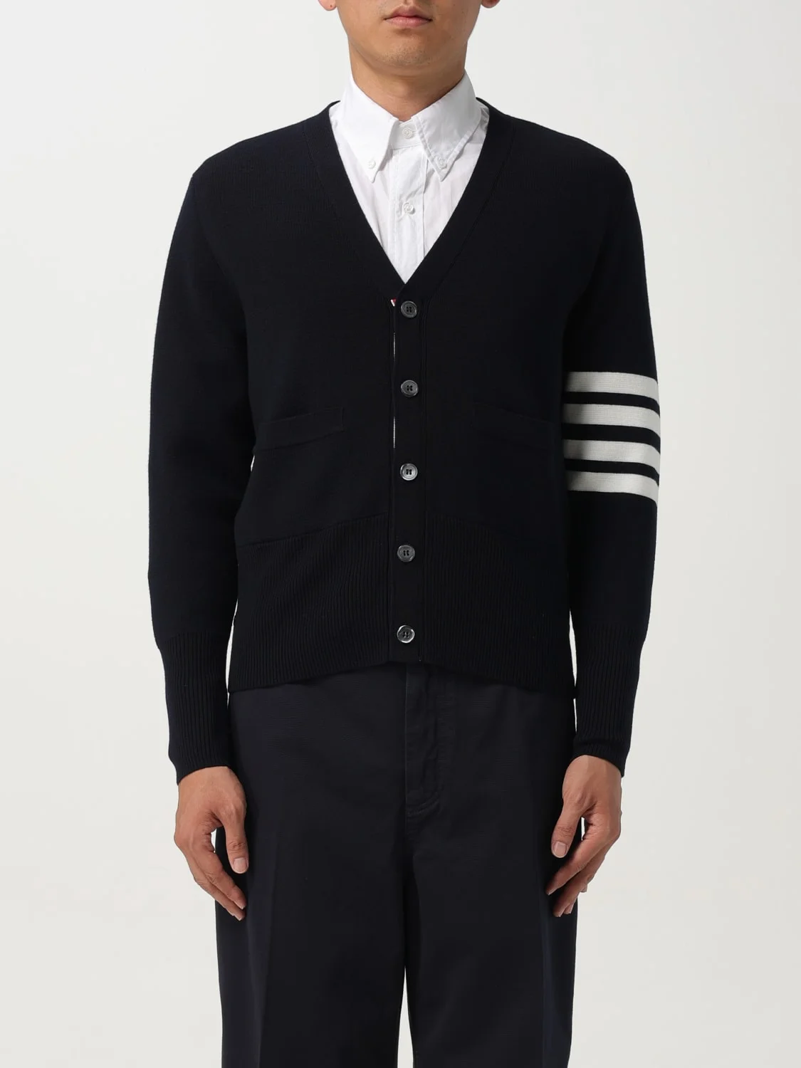 DESCRIPTION - Style: Classic, College - Neckline: V neckline - Shoulders: Regular - Sleeves: Long - Cuffs: Ribbed - Closure: With buttons - Bottom: With ribbed edges - Logo: 4-bar Thom Browne - Materials: Virgin wool - Pattern: Plain-colored, Stripes DETAILS AND CARE Composition 100% virgin wool SIZE AND FIT Sizes not available Size and fit Regular fit Designer code: MKC160A00014 415 Giglio Code: H13855 Designer: Thom Browne Collection: Thom Browne Men Category: Clothing Thom Browne