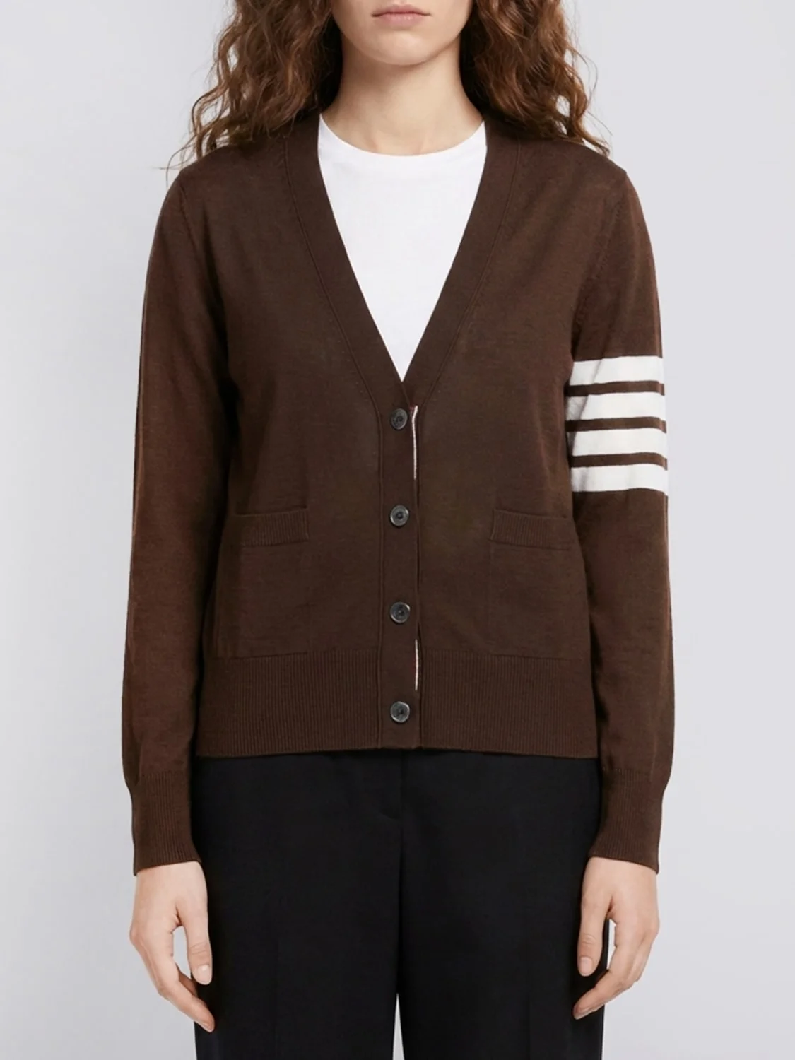 DESCRIPTION - Style: College - Neckline: V neckline - Shoulders: Regular - Sleeves: Long - Cuffs: Ribbed - Closure: With buttons - Pockets: Patch pocket - Bottom: With ribbed edges - Logo: Thom Browne 4-bar - Materials: Wool - Pattern: Plain-colored DETAILS AND CARE Composition not available SIZE AND FIT Sizes not available Size and fit Regular fit Designer code: FKC334AY1014 208 Giglio Code: H79596 Designer: Thom Browne Collection: Thom Browne Woman Category: Clothing Thom Browne
