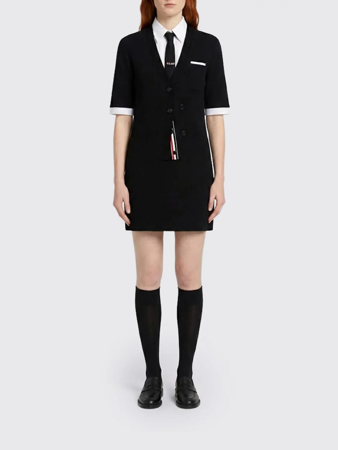 DESCRIPTION - Style: College - Model: Knit, Sheath, Trompe-l'œil - Neckline: Crewneck - Shoulders: Regular - Bottom: With straight hemline - Length: Mini dresses - Occasion: Morning dresses - Sleeves: Short-sleeve dresses - Materials: Wool - Pattern: Graphic DETAILS AND CARE Composition _100%WO SIZE AND FIT Sizes not available Size and fit Regular fit Designer code: FDSF33E06455 001 Giglio Code: I05624 Designer: Thom Browne Collection: Clothing Thom Browne Category: Clothing > Dress
