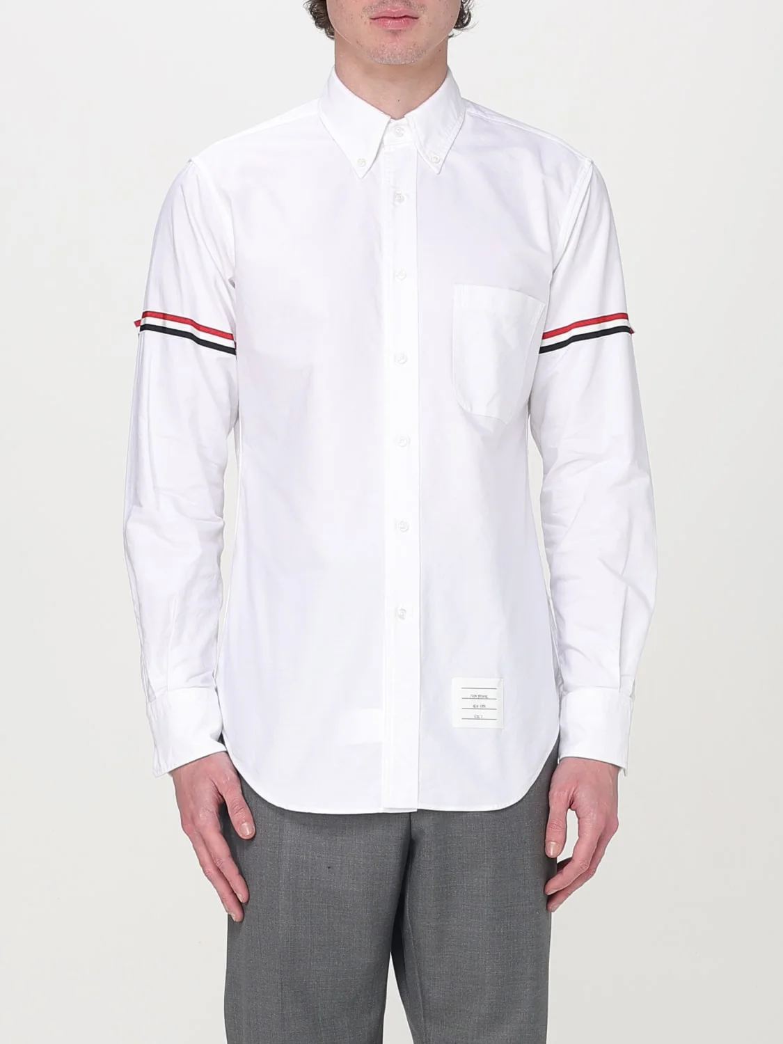 DESCRIPTION - Style: College - Neck: Button-down - Shoulders: Regular - Closure: With buttons - Bottom: With straight hemline - Logo: Flag - Sleeves: Long sleeve shirts - Materials: Cotton poplin - Pattern: Plain-colored DETAILS AND CARE Composition 100% cotton SIZE AND FIT Sizes not available Size and fit Slim fit Designer code: MWL150EF0313 100 Giglio Code: G50275 Designer: Thom Browne Collection: Thom Browne Men Category: Clothing Thom Browne