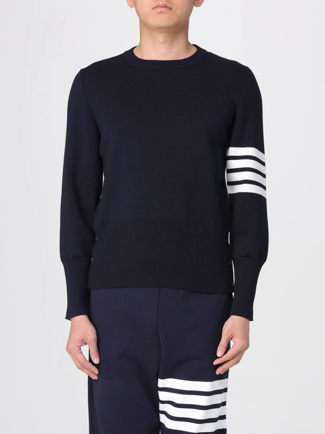 DESCRIPTION - Style: College - Details: With buttons - Model: Crewneck - Neckline: Crewneck - Shoulders: Regular - Sleeves: Long - Cuffs: Ribbed - Bottom: With side slit - Logo: undefined - Materials: Wool - Pattern: Stripes DETAILS AND CARE Composition _100%WO SIZE AND FIT Sizes not available Size and fit Slim fit Designer code: MKA189A00014 415 Giglio Code: H11375 Designer: Thom Browne Collection: Thom Browne Men Category: Clothing Thom Browne