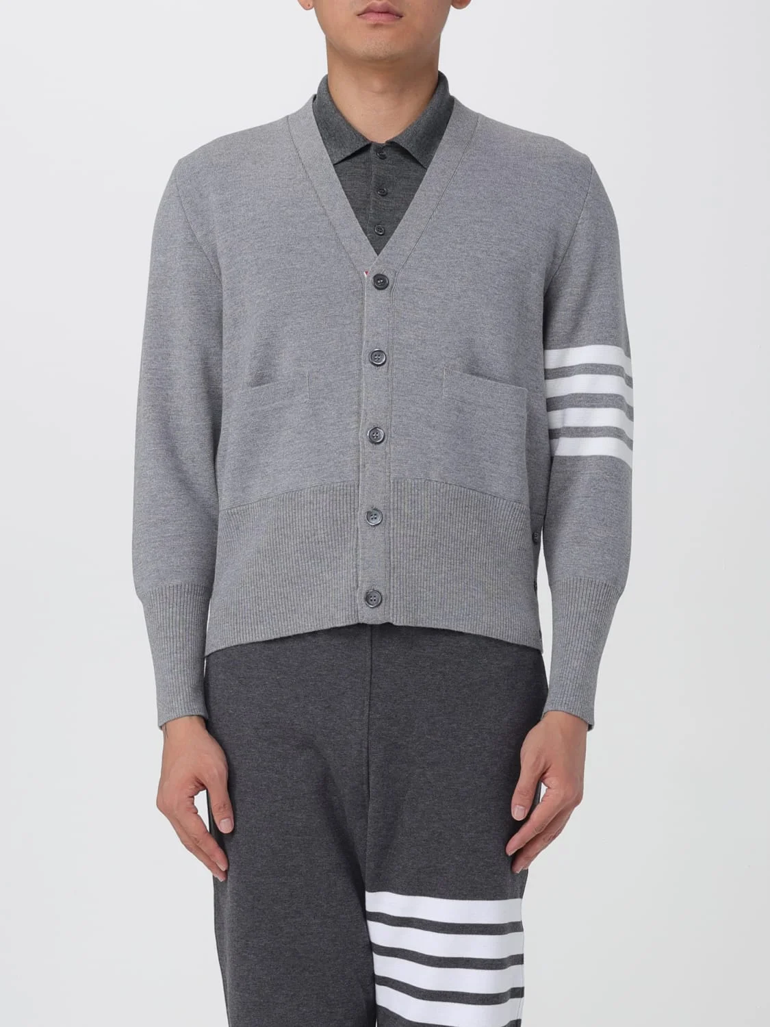 DESCRIPTION - Style: Vintage - Neckline: V neckline - Shoulders: Regular - Sleeves: Long - Closure: With buttons - Pockets: Patch pocket - Bottom: With straight hemline - Logo: 4-bar Thom Browne - Materials: Virgin wool - Pattern: Bicolor DETAILS AND CARE Composition _100% wv SIZE AND FIT Sizes not available Size and fit Regular fit Designer code: MKC160A055 055 Giglio Code: H33721 Designer: Thom Browne Collection: Thom Browne Men Category: Clothing Thom Browne