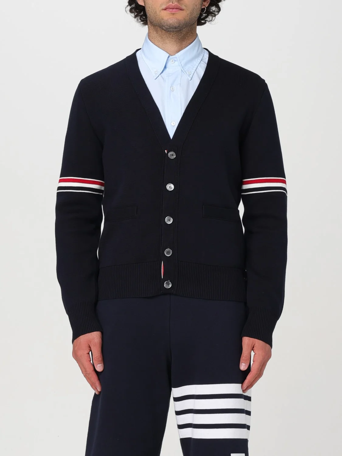 DESCRIPTION - Style: College - Details: With bands - Neckline: V neckline - Sleeves: Long - Closure: With buttons - Logo: With logo - Occasion: Morning - Materials: Cotton DETAILS AND CARE Composition MAN COTTON CARDIGAN SIZE AND FIT Sizes not available Size and fit Slim fit Designer code: MKC310AY3007 415 Giglio Code: F71358 Designer: Thom Browne Collection: Thom Browne Men Category: Clothing Thom Browne