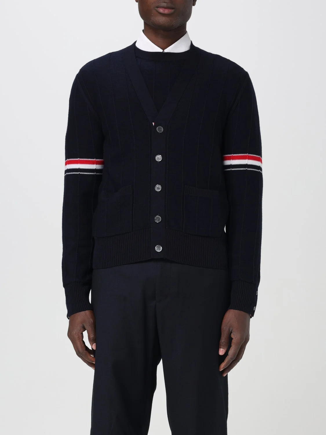 DESCRIPTION - Style: Casual - Neckline: V neckline - Closure: With buttons - Logo: Thom Browne 4-bar - Materials: Virgin wool DETAILS AND CARE Composition 100% VIRGIN WOOL SIZE AND FIT Sizes not available Size and fit Regular fit Designer code: MKC519AY1002 415 Giglio Code: 402722 Designer: Thom Browne Collection: Thom Browne Men Category: Clothing Thom Browne