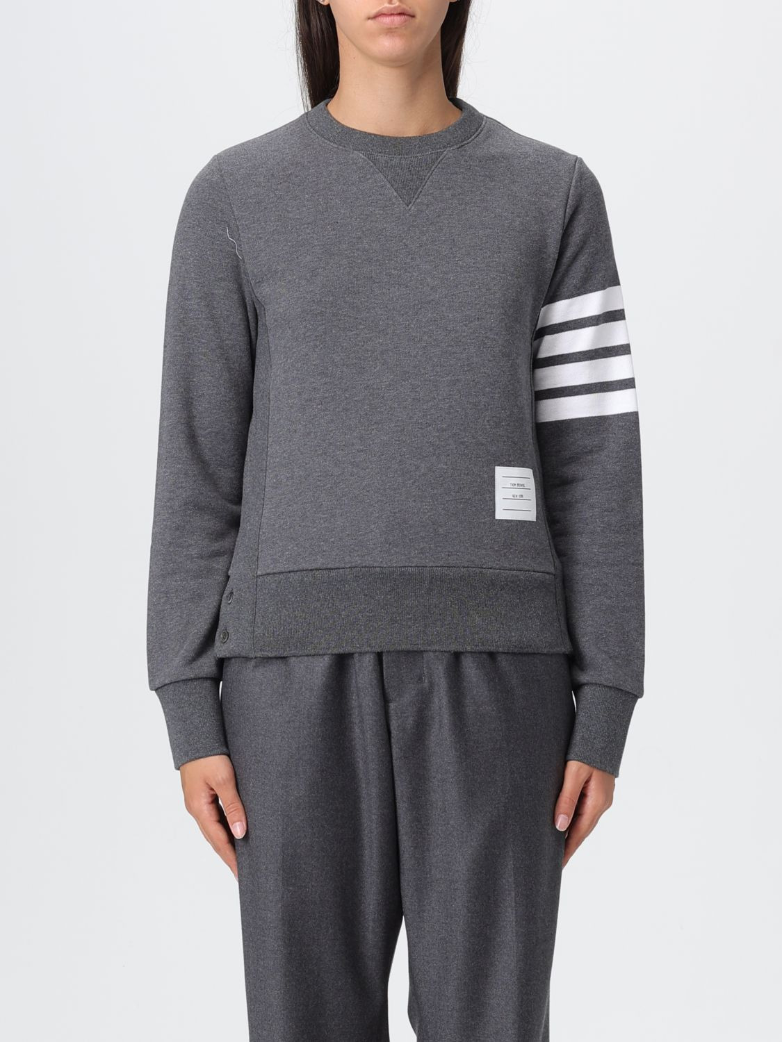 DESCRIPTION - Style: College - Model: Crewneck - Neckline: Crewneck - Shoulders: Regular - Sleeves: Long - Cuffs: Ribbed - Bottom: With ribbed edges - Logo: undefined - Materials: Wool - Pattern: Plain-colored DETAILS AND CARE Composition _100%CO SIZE AND FIT Sizes not available Size and fit Slim fit Designer code: FJT002A025 025 Giglio Code: H33722 Designer: Thom Browne Collection: Thom Browne Woman Category: Clothing Thom Browne