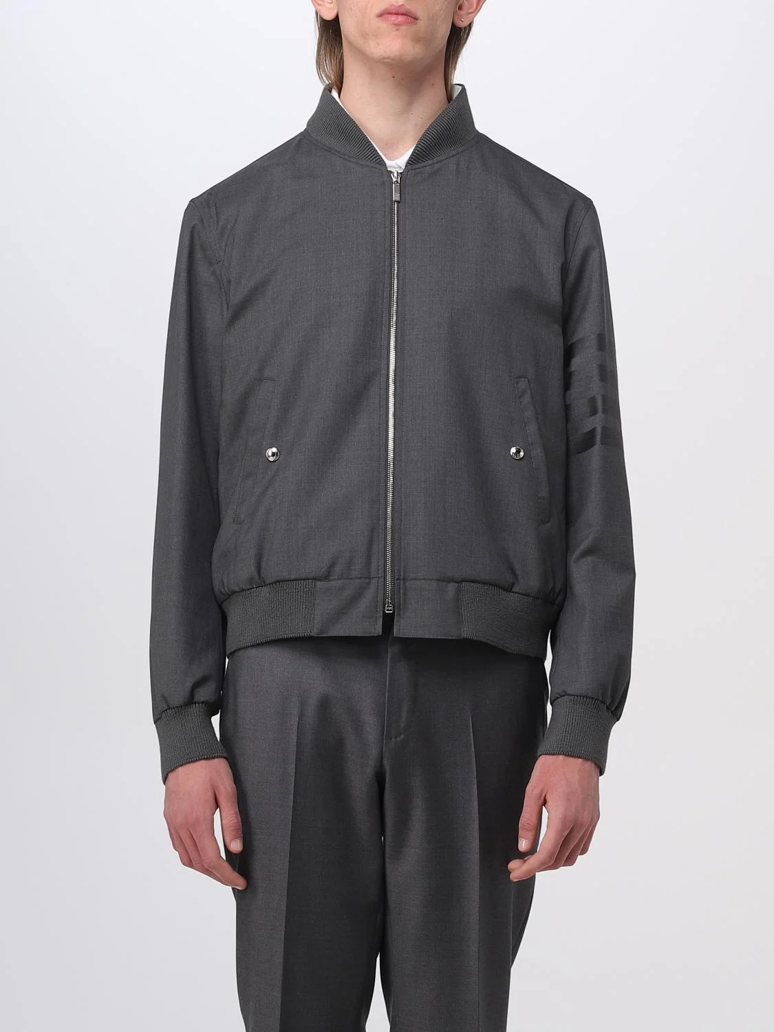 DESCRIPTION - Style: College - Shoulders: Relaxed - Sleeves: Long - Closure: With zip - Pockets: America - Bottom: With straight hemline - Neck: Bomber - Length: Short jackets - Logo: 4-bar Thom Browne - Materials: Wool - Pattern: Plain-colored, Stripes DETAILS AND CARE Composition 100% WOOL SIZE AND FIT Sizes not available Size and fit Relaxed fit Designer code: MJO030A06146 025 Giglio Code: D83658 Designer: Thom Browne Collection: Thom Browne Men Category: Clothing Thom Browne