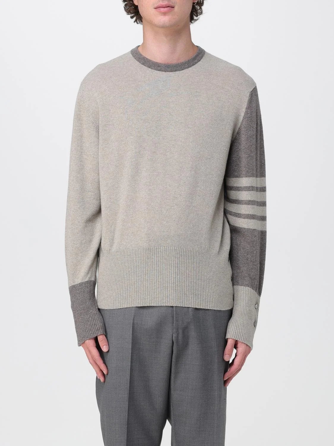 Descrizione - Casual style - Regular fit - Cashmere - Knitted - Crew neckline - Ribbed profiles - Regular shoulders - Long sleeves - Contrasting 4 Bar Stripe Thom Browne detail - Cuffs with buttons - Thom Browne logo flag on the back - Straight hem DETAILS AND CARE Composition MAN CASHMERE SWEATER SIZE AND FIT Sizes not available Designer code: MKA001F00011 265 Giglio Code: E71504 Designer: Thom Browne Collection: Thom Browne Men Category: Clothing Thom Browne