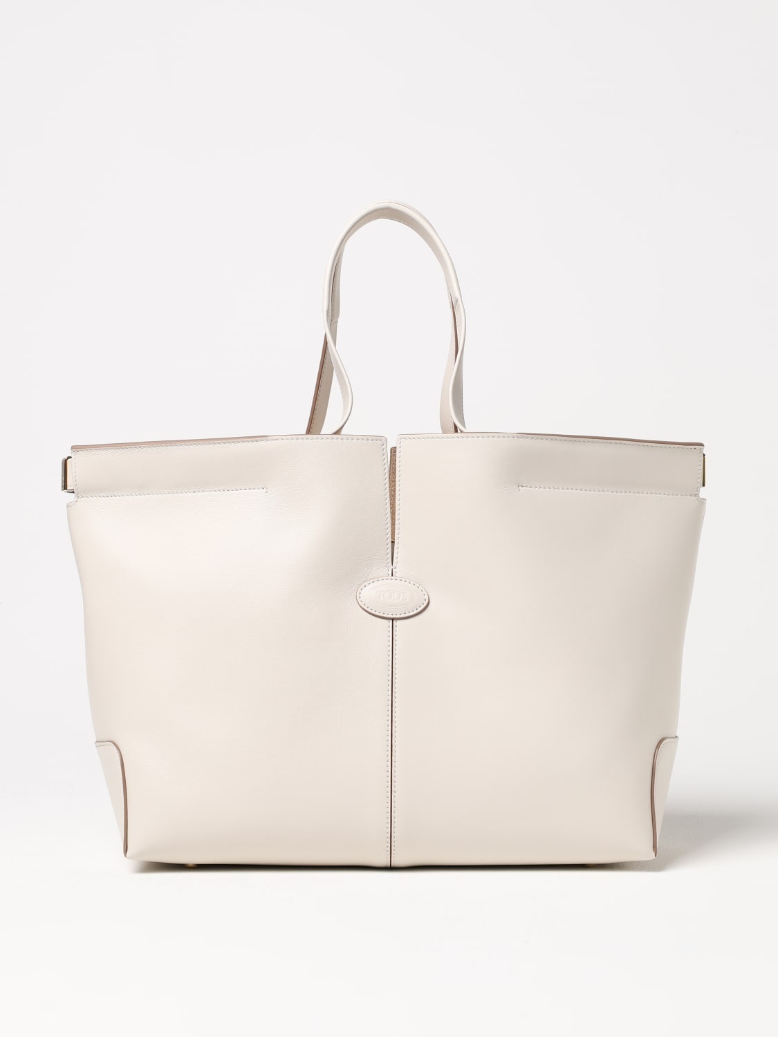 DESCRIPTION - Logo: Engraved, Lettering - Lining: With removable pouch, Suede leather - Model: Shoulder - Bottom: With protective feet at the bottom, Metal - Shape: Flared - Handle: Double - Materials: Smooth calfskin - Pattern: Plain-colored DETAILS AND CARE Composition _100%le SIZE AND FIT Sizes Width : 32 cm Height: 25 cm Depth: 15 cm Handle height: 16 cm Designer code: XBWDBMA0250ROR B015 Giglio Code: G44577 Designer: Tod's Collection: Tod's Woman Category: Bags Tod's