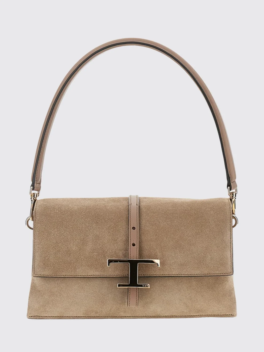 DESCRIPTION - Style: Casual - Logo: Metallic, Tod's T Timeless - Model: Shoulder - Closure: With button flap - Pockets: Back patch pocket - Shape: Rectangular - Handle: Removable - Shoulder strap: Adjustable and removable - Lining: With 2 compartments - Occasion: Morning - Materials: Suede calfskin - Pattern: Monogram DETAILS AND CARE Composition 100% CALFSKIN SIZE AND FIT Sizes Width : 26,5 cm Height: 16 cm Depth: 6 cm Designer code: XBWTSEC9100P3A 5L26 Giglio Code: H86330 Designer: Tod's Collection: Tod's Woman Category: Bags Tod's