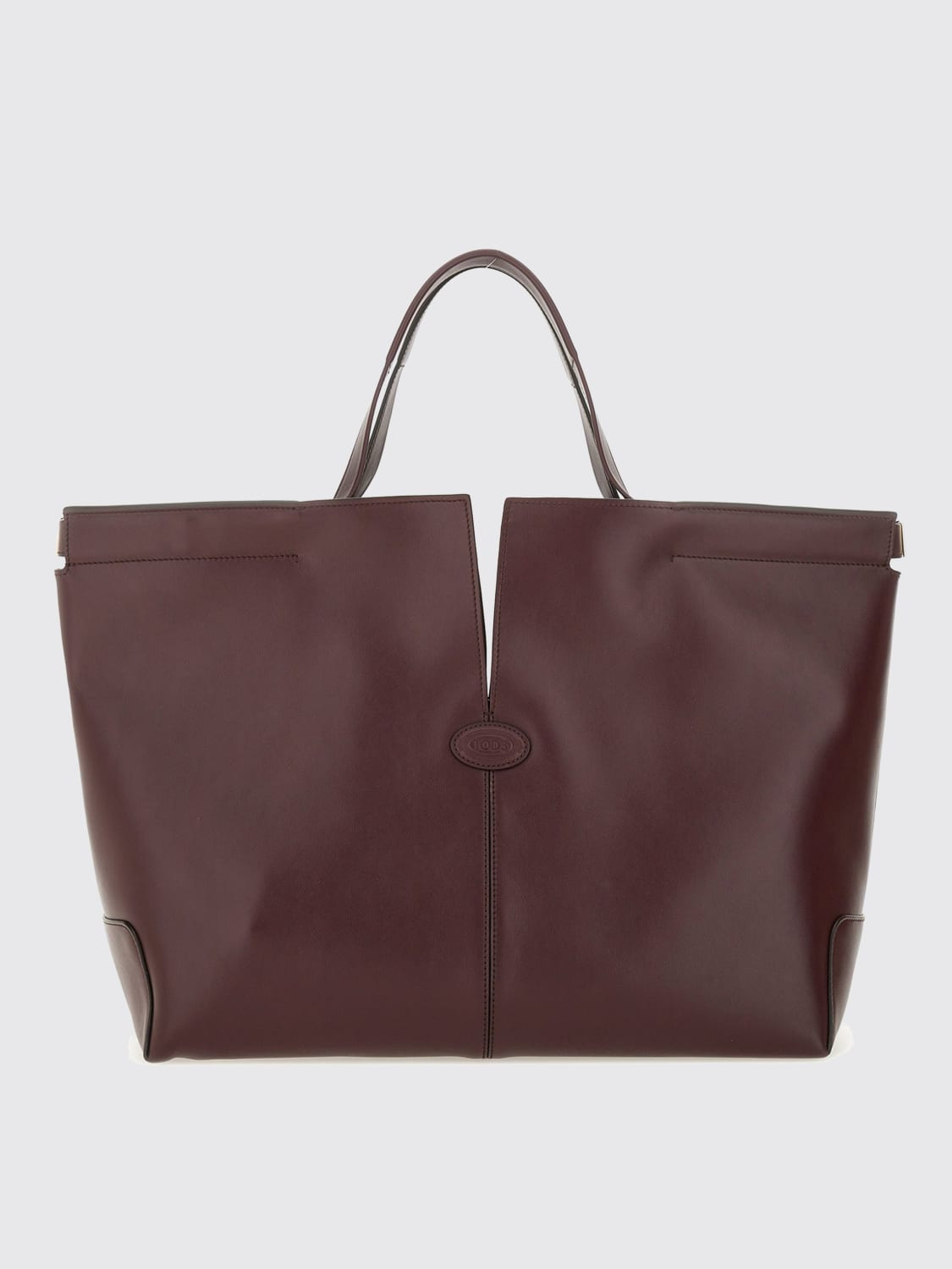 DESCRIPTION - Style: Vintage - Logo: Engraved - Lining: Suede - Model: Hand - Closure: Press stud closure with resin studs - Shape: Flared - Handle: Double - Materials: Smooth calfskin - Pattern: Plain-colored DETAILS AND CARE Composition CALFSKIN SIZE AND FIT Sizes Width : 49 cm Height: 31 cm Depth: 16 cm Handle height: 17 cm Designer code: XBWDBMA0300ROR R822 Giglio Code: H32240 Designer: Tod's Collection: Tod's Woman Category: Bags Tod's