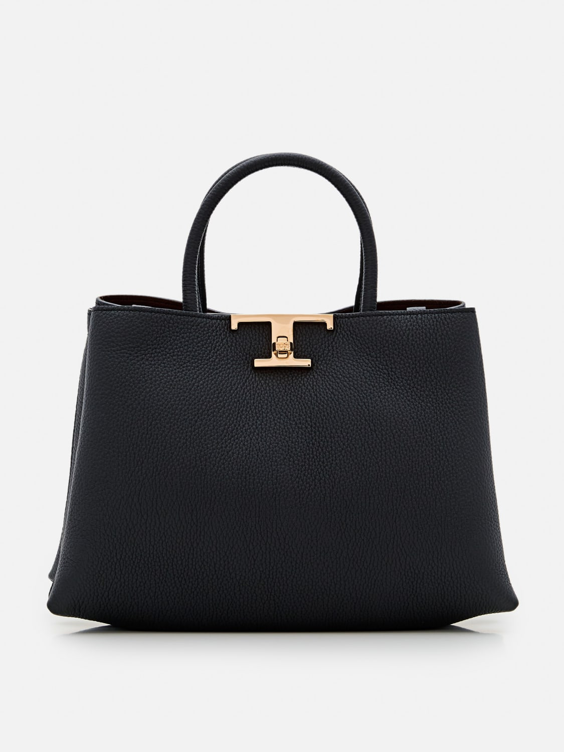 DESCRIPTION - Logo: Tod's T Timeless - Lining: undefined - Model: Hand - Closure: With metal interlocking mechanism - Shape: Rectangular - Handle: Double - Shoulder strap: Adjustable and removable - Measurements: Shoulder strap length from shoulder: 52 cm - Materials: Grained calfskin - Pattern: Monogram DETAILS AND CARE Composition le SIZE AND FIT Sizes Width : 28 cm Height: 19 cm Depth: 11 cm Handle height: 9,5 cm Designer code: XBWTSQF0200XWZ B999 Giglio Code: 416400 Designer: Tod's Collection: Tod's Woman Category: Bags Tod's