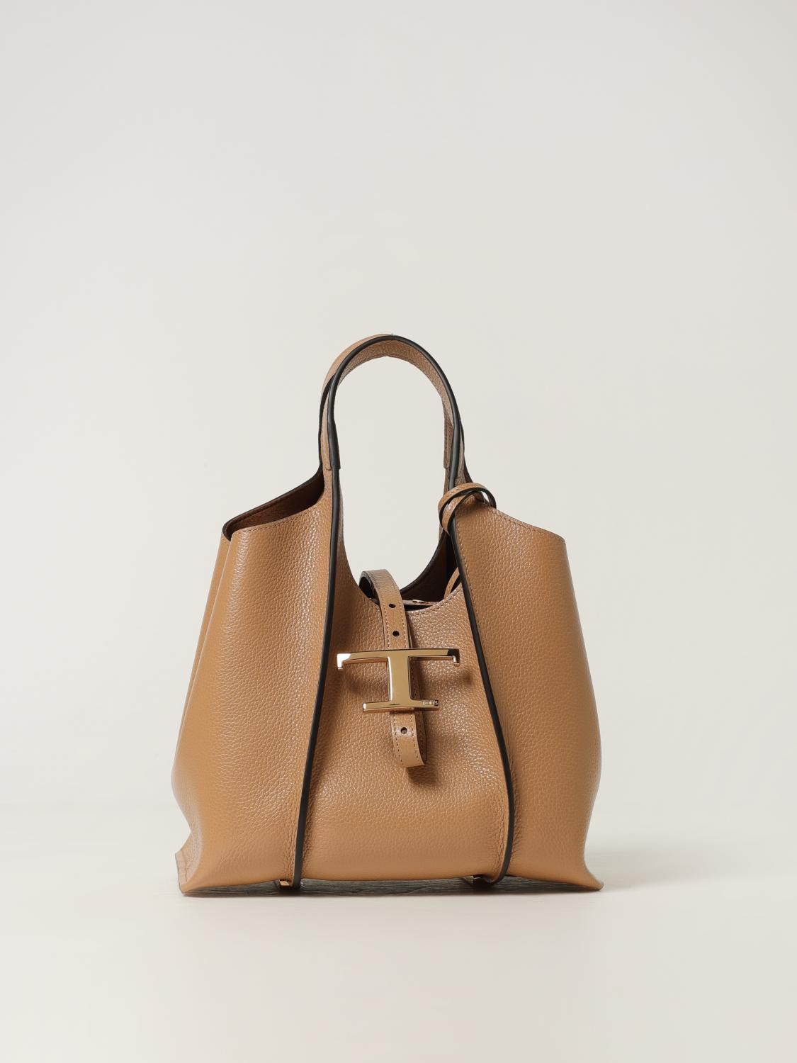 DESCRIPTION - Style: Vintage - Lining: With removable pouch - Model: Shoulder - Bottom: With protective feet at the bottom - Shape: Flared - Handle: Double - Shoulder strap: Adjustable and removable - Closure: With tab - Materials: Grained calfskin - Pattern: Plain-colored - Logo: Tod's T Timeless DETAILS AND CARE Composition CALFSKIN SIZE AND FIT Sizes Width : 22 cm Height: 18 cm Depth: 13 cm Designer code: XBWTSBA9100XSO C811 Giglio Code: 437555 Designer: Tod's Collection: Tod's Woman Category: Bags Tod's