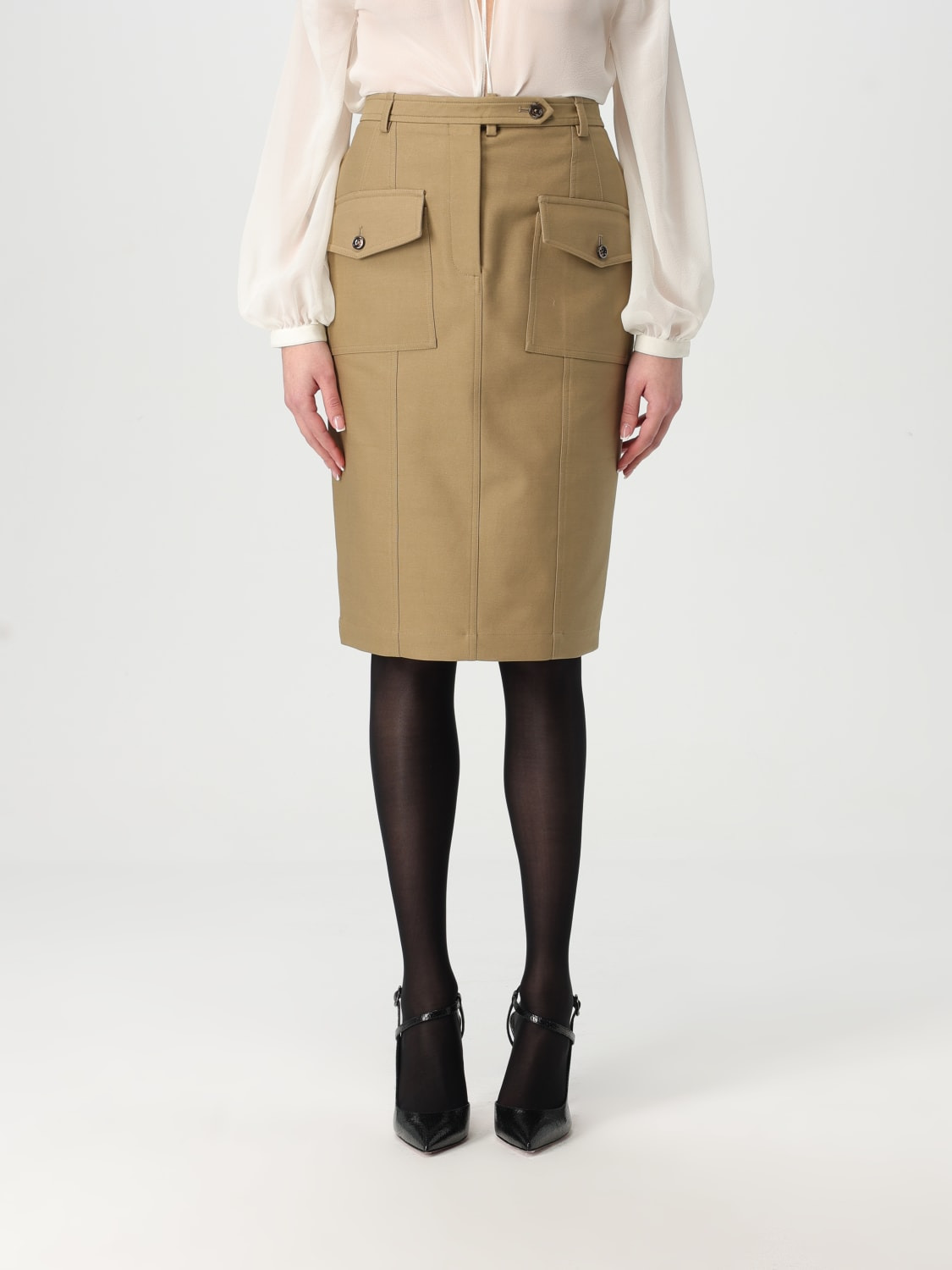 DESCRIPTION - Style: Urban-street - Model: Cargo - Closure: With button and zip - Pockets: Patch pocket with flap and button - Waist: High waist - Bottom: With back slit - Length: Midi skirts - Materials: Stretch cotton - Pattern: Plain-colored DETAILS AND CARE Composition Fabric: 97%Cotton - 3%Elastane / Lining: 10 SIZE AND FIT Sizes not available Size and fit Regular fit Designer code: GC5768FAX1402 FG510 Giglio Code: G48022 Designer: Tom Ford Collection: Tom Ford Woman Category: Clothing Tom Ford