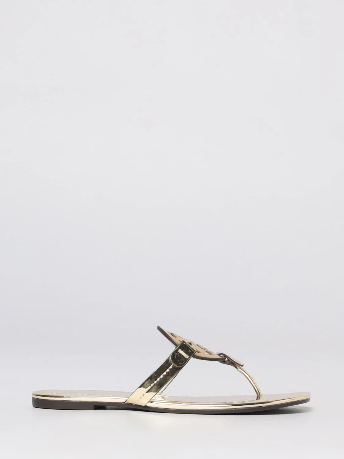 DESCRIPTION - Style: Casual - Lining: Leather, With logo - Logo: Engraved, Tory Burch double T - Model: Flip flops - Toe: Open, Round - Sole: Leather - Heel: Low heel - Occasion: Morning - Materials: Laminated calfskin - Pattern: Monogram DETAILS AND CARE Composition 100% calf leather/rubber sole SIZE AND FIT Sizes not available Designer code: 170345 700 Giglio Code: I00288 Designer: Tory Burch Collection: Shoes Tory Burch Category: Shoes > Heeled sandal