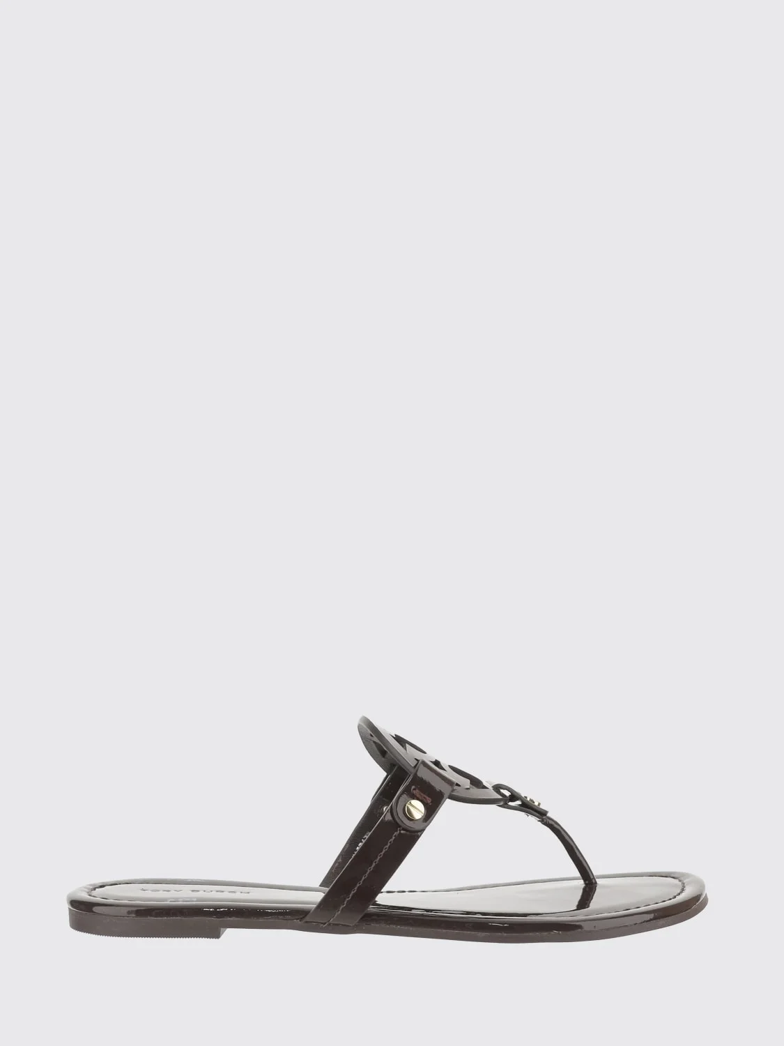 DESCRIPTION - Style: Casual - Lining: Leather, With logo - Model: Flip flops - Toe: Open, Round - Sole: Rubber - Heel: Low heel - Logo: Tory Burch double T - Occasion: Morning - Materials: Patent leather - Pattern: Monogram DETAILS AND CARE Composition Upper : 100% Bovine Leather; Lining : 100% Ov SIZE AND FIT Sizes not available Designer code: 11743 212 Giglio Code: H85039 Designer: Tory Burch Collection: Shoes Tory Burch Category: Shoes > Heeled sandal