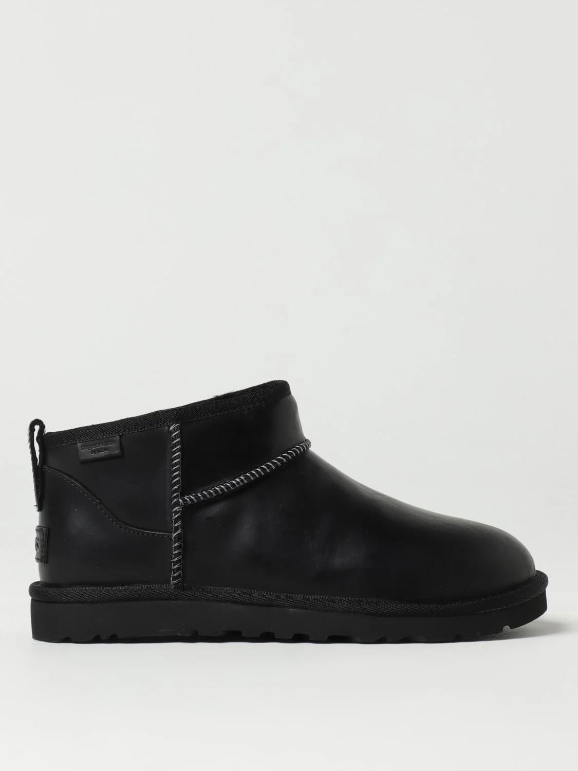 DESCRIPTION - Logo: Back - Details: With back tab - Lining: Fur, With logo - Model: Slip on, Snow - Toe: Round - Shaft: Low - Sole: EVA - Materials: Smooth leather - Pattern: Plain-colored DETAILS AND CARE Composition 100% Leather SIZE AND FIT Sizes not available Designer code: 1158191 BLK Giglio Code: G80624 Designer: UGG Collection: UGG Men Category: Shoes UGG