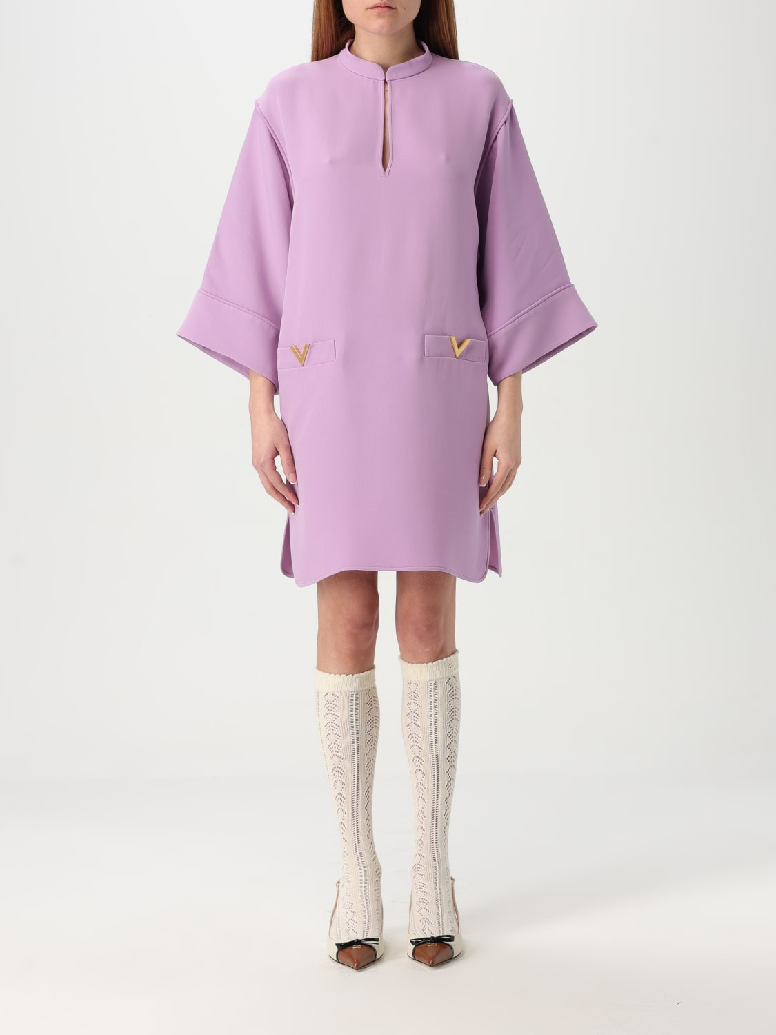 DESCRIPTION - Style: Elegant - Logo: Metallic - Model: Chemisier - Neck: Mandarin collar - Shoulders: Relaxed - Bottom: With straight hemline - Length: Mini dresses - Occasion: Morning dresses - Sleeves: Long sleeve dresses - Materials: Silk - Pattern: Plain-colored DETAILS AND CARE Composition 100%SILK SIZE AND FIT Sizes not available Size and fit Relaxed fit Designer code: 6B3VAEW11MM R3H Giglio Code: G53652 Designer: Valentino Collection: Valentino Woman Category: Clothing Valentino