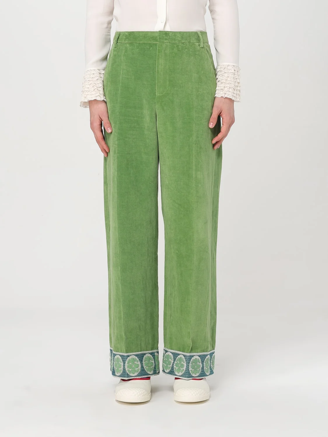 WASHED COTTON-LINEN VELVET PANTS WITH JACQUARD HEMS